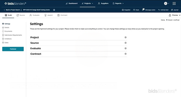 Create and post bids to your branded self-service portal or send invitations to prequalified suppliers. Configure projects from a template or customize your own and then manage your team members, vendor meetings and notifications, and more.