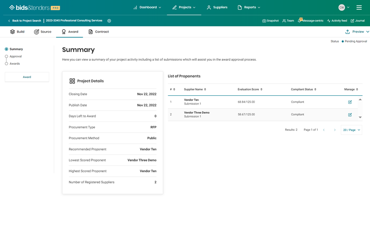 Our Award Approval add-on brings efficiency, transparency, cost savings, accuracy, and compliance to the procurement process, leading to improved operations and better outcomes. Save time by routing your award approval through bids&tenders. No need to worry about lost or misplaced reports on approvers desks!